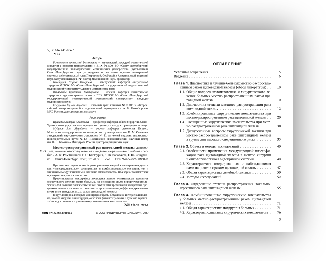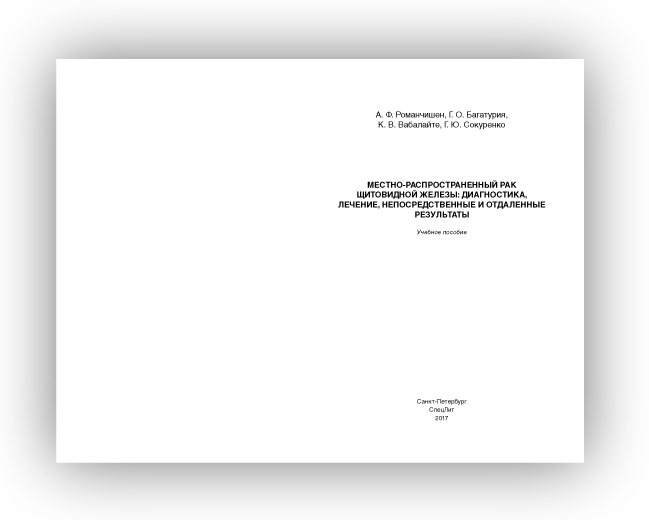 Местно-распространенный рак щитовидной железы : диагностика, лечение, непосредственные и отдаленные результаты : учеб. пособие / А. Ф. Романчишен [и др.]. - СПб. : СпецЛит, 2017. - 174, [2] с. : ил., табл.