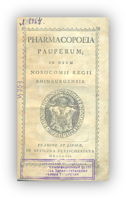 Pharmacopoeia pauperum, in usum nosocomii regii Edinburgensis. - Edinburg: [s. n.], 1762. – IV, 76 p.