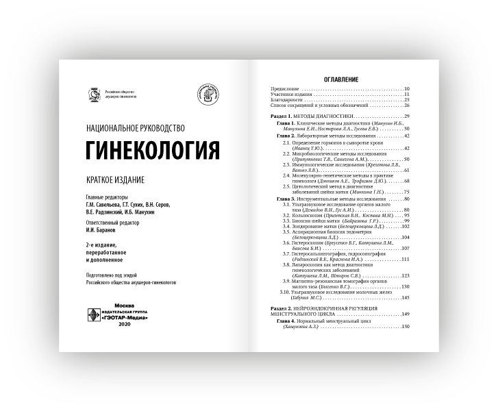 Гинекология: национальное руководство: краткое изд. / [Л. В. Адамян, О. В. Азиев, В. О. Андреева и др.]; гл. ред.: Г. М. Савельева [и др.]; отв. ред. И. И. Баранов; Российское общество акушеров-гинекологов. - 2-е изд., перераб. и доп. – М.: ГЭОТАР-Медиа, 2020. - 1044, [2] с., [12] л. фот. цв.: ил., табл.