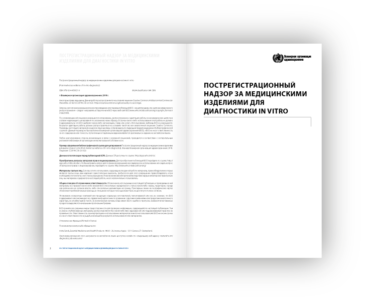 Пострегистрационный надзор за медицинскими изделиями для диагностики IN VITRO: [руководство : пер. с англ.] / ВОЗ ; [сост.: A. Sands, I. Prat ; под общ. рук.: I. Prat, M. Zweygarth]. - М. : Медицина, 2018. - 60 с. : ил., табл.