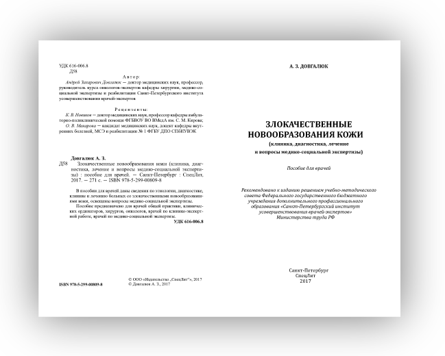 Злокачественные новообразования кожи : (клиника, диагностика, лечение и вопросы медико-социальной экспертизы) : пособие для врачей / А. З. Довгалюк ; [ФГБУ ДПО "Санкт-Петербург. ин-т усоверш. врачей-экспертов" М-ва труда РФ]. - СПб. : СпецЛит, 2017. - 270, [2] с. : ил., табл.