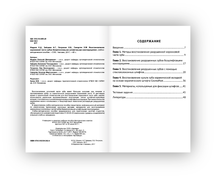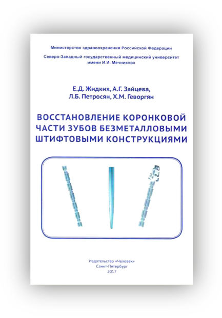 Восстановление коронковой части зубов безметалловыми штифтовыми конструкциями: учеб.-метод. пособие/ Е. Д. Жидких [и др.]; М-во здравоохранения РФ, ФГБОУ ВО "Северо-Запад. гос. мед. ун-т им. И.И. Мечникова" М-ва здравоохранения РФ, Каф. ортопед. стоматологии. - СПб.: Человек, 2017. - 48 с.: ил.