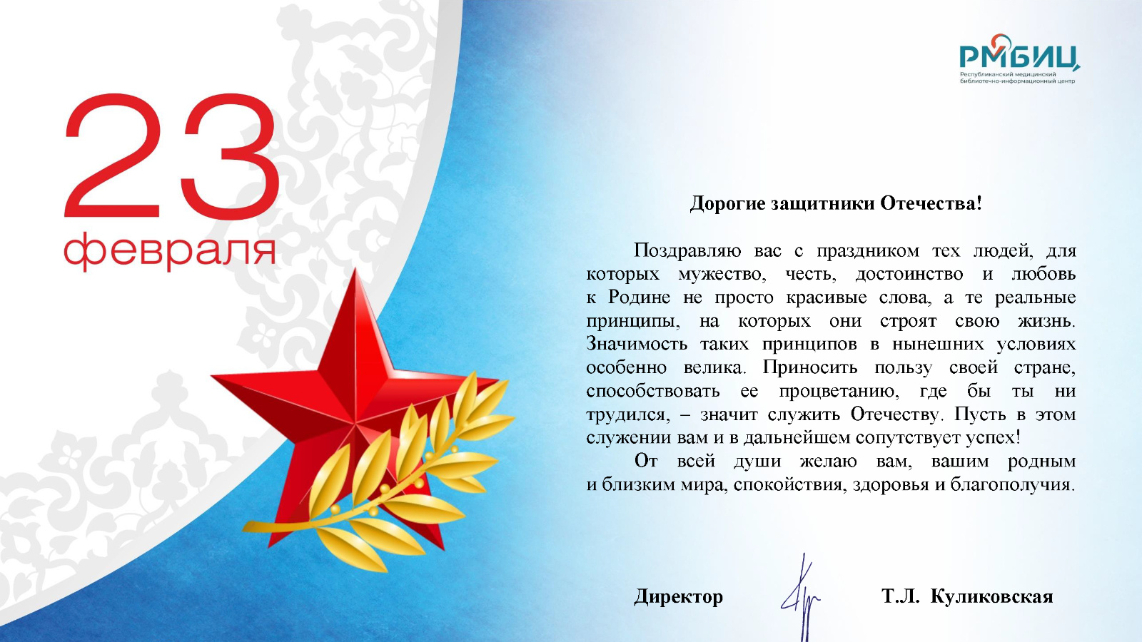 Поздравляю вас с праздником тех людей, для которых мужество, честь, достоинство и любовь к Родине не просто красивые слова, а те реальные принципы, на которых они строят свою жизнь. Значимость таких принципов в нынешних условиях особенно велика. Приносить пользу своей стране, способствовать ее процветанию, где бы ты ни трудился, – значит служить Отечеству. Пусть в этом служении вам и в дальнейшем сопутствует успех!