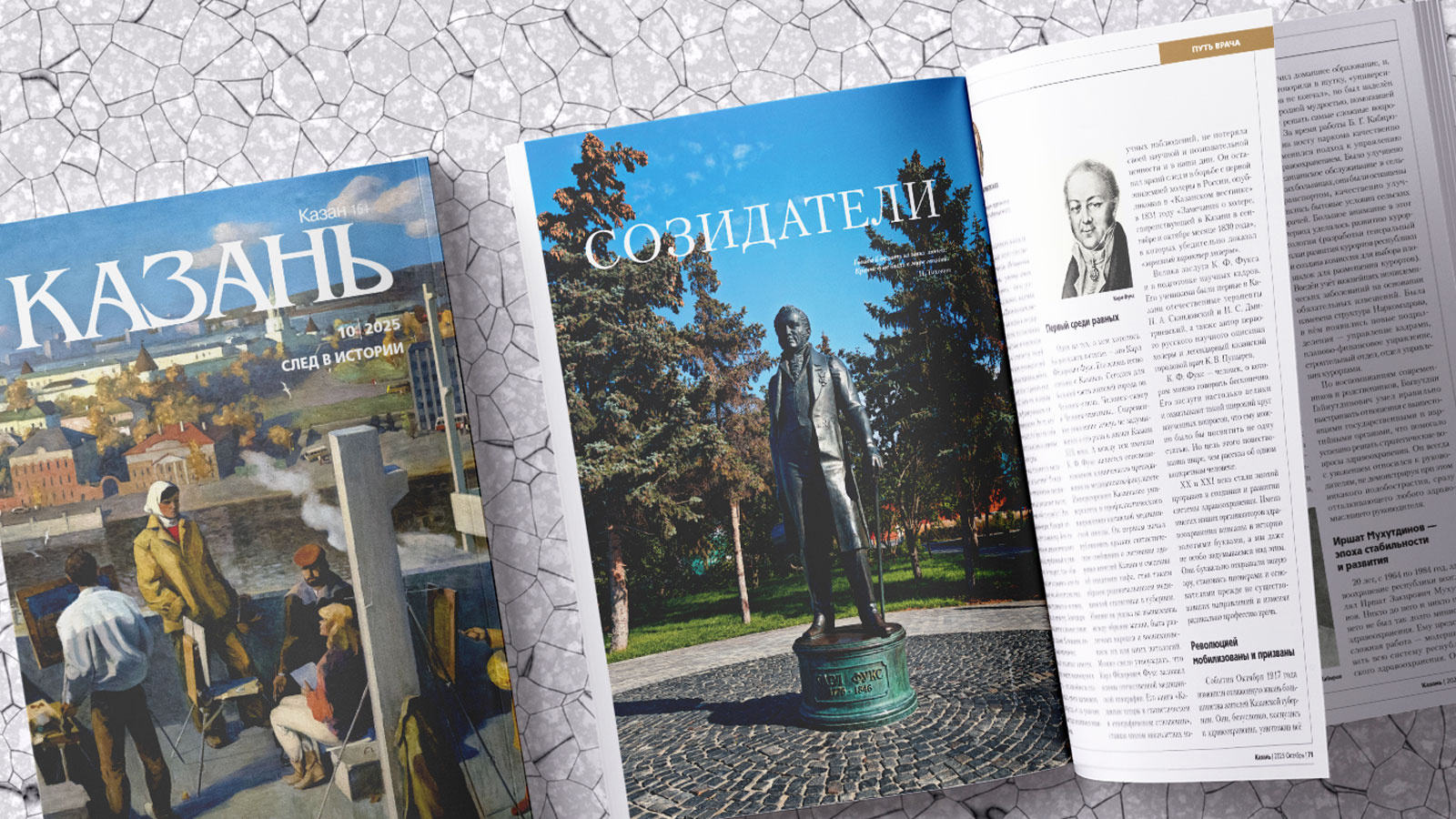 Вышел в свет десятый номер журнала «Казань», посвященный замечательным казанцам, оставившим значительный след в жизни нашего города и далеко за его пределами. В нем опубликована статья Т.Л. Куликовской, рассказывающая о людях, изменивших систему здравоохранения в нашей республике. Героями публикации стали декан медицинского факультета и ректор Императорского Казанского университета К.Ф. Фукс, наркомы и министры здравоохранения ТАССР и РТ К.Г. Мухтаров, Ш.Г. Гайнутдинов, Б.Г. Кабиров, И.З. Мухутдинов, К.Ш. Зыятдинов и М.Н. Садыков.