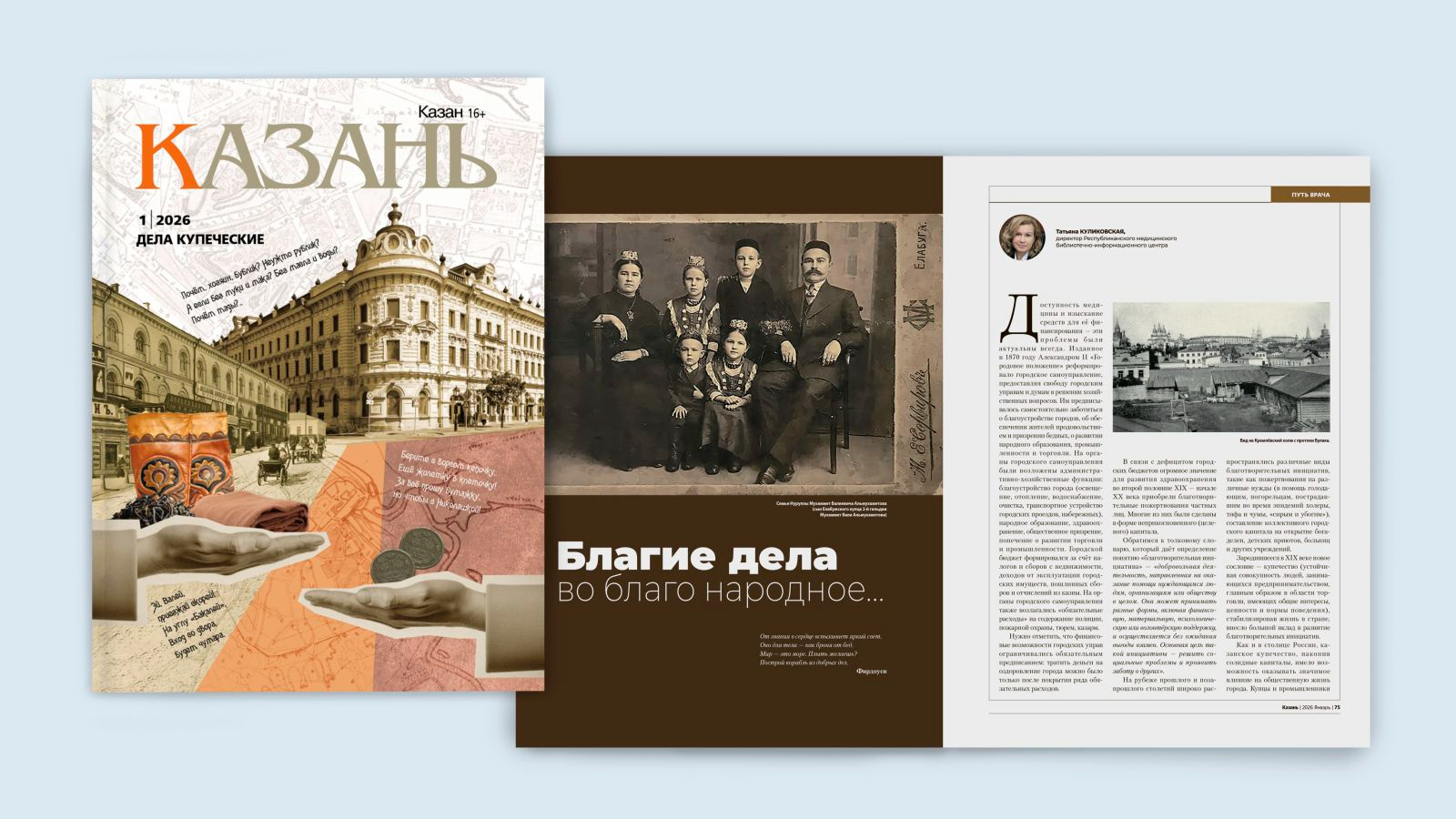 Вышел в свет первый в 2026 году номер журнала «Казань». Его темой стала разнообразная деятельность купечества как отдельного социального класса, сыгравшего немаловажную роль в развитии промышленной и социальной инфраструктуры Казани. Большой вклад в возникновение городских больниц, обеспеченных неприкосновенным капиталом, внесли казанские предприниматели, оказывавшие путем масштабной благотворительной работы огромное влияние на их возникновение. Об этом рассказывает в своей статье Татьяна Львовна Куликовская.