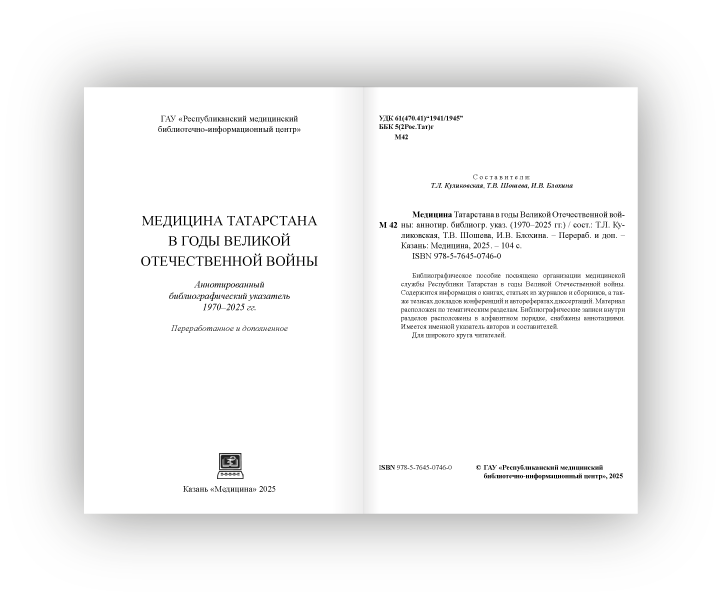 Медицина Татарстана в годы Великой Отечественной войны: аннотир. библиогр. указ. (1970–2025 гг.) / сост.: Т.Л. Куликовская, Т.В. Шошева, И.В. Блохина. – Перераб. и доп. – Казань: Медицина, 2025. – 104 с.