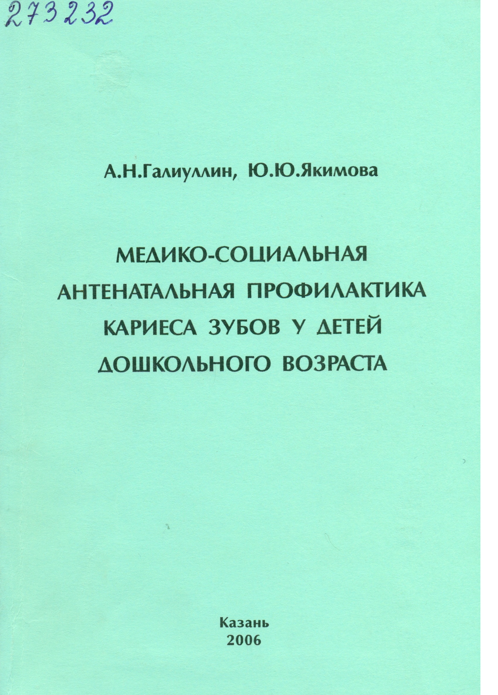 Медико-социальная антенатальная профилактика кариеса зубов у детей дошкольного возраста / А. Н. Галиуллин, Ю. Ю. Якимова ; М-во здравоохранения и соц. развития РФ, ГОУ ВПО "Казан. гос. мед. ун-т Федер. агентства по здравоохранению и соц. развитию". - Казань : Медицина, 2006. - 98, [2] с. : ил., табл.