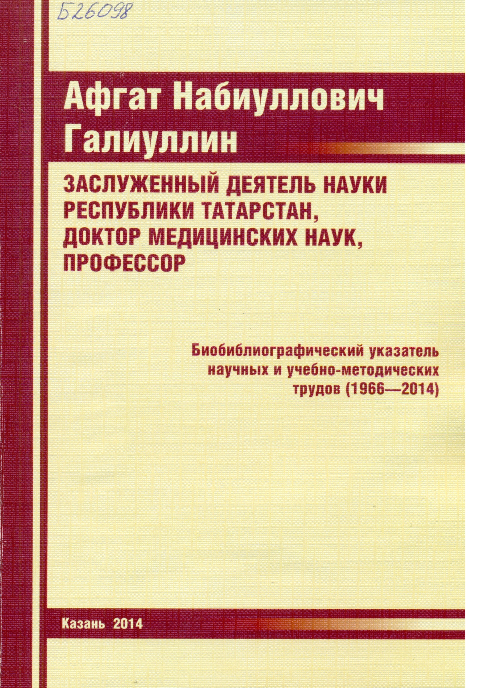 Афгат Набиуллович Галиуллин, заслуженный деятель науки Республики Татарстан, доктор медицинских наук, профессор : биобиблиогр. указ. науч. и учеб.-метод. тр. (1966-2014) / ГБОУ ВПО "Казан. гос. мед. ун-т" М-ва здравоохранения России ; [сост. А. Н. Галиуллин]. - Казань : Медицина, 2014. - 85, [3] с. : фот.
