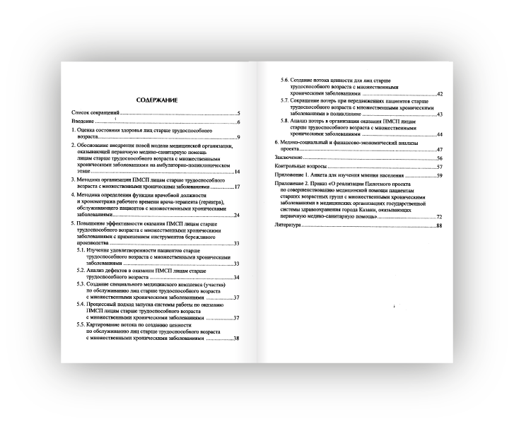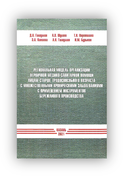 Региональная модель организации первичной медико-санитарной помощи лицам старше трудоспособного возраста с множественными хроническими заболеваниями с применением инструментов бережливого производства: методические рекомендации/ Д.А. Галиуллин, А.В. Шулаев, Т.Н. Воротилина, Э.А. Китаева [и др.]; Министерство здравоохранения РФ, Министерство здравоохранения РТ, ФГБОУ ВО "Казанский государственный медицинский университет" Министерства здравоохранения России, Кафедра общей гигиены, Учебно-методический центр "Бережливые технологии в здравоохранении". - Казань: Медицина, 2021. - 88, [2] с.: ил., табл.