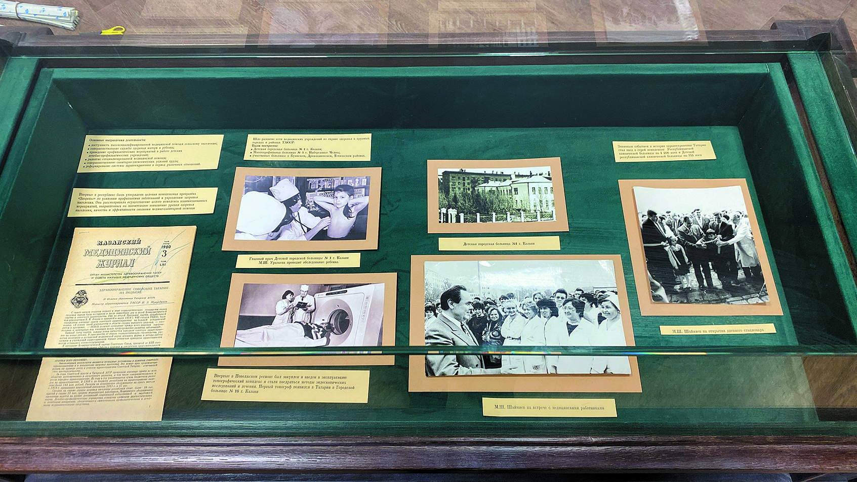 Экспозиция не ограничивается одним помещением, она нашла своё логическое продолжение в коридорах министерства, где на стенах разместились стильно оформленные панно, рассказывающие об истории знаменитых клиник республики, выдающихся деятелях здравоохранения Татарстана.