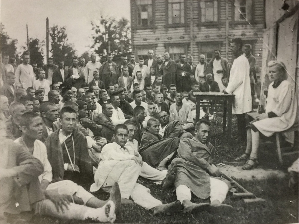 Больные и раненные во дворе госпиталя, размещенного в ДК Меховщиков