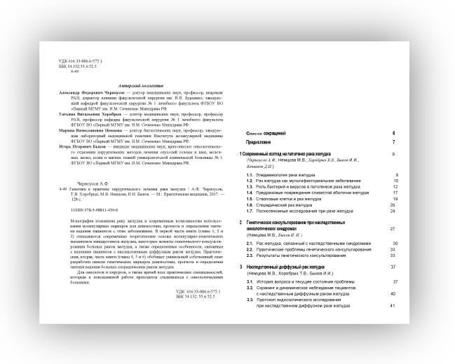 Генетика в практике хирургического лечения рака желудка / А. Ф. Черноусов [и др. ; М-во здравоохранения РФ, ГБОУ ВПО "Первый Моск. гос. мед. ун-т им. И. М. Сеченова"]. - М. : Практ. медицина, 2017. - 127, [1] с. : ил., табл.